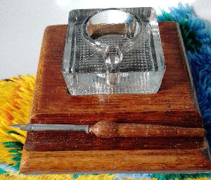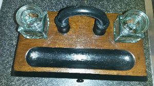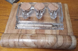 1930s/40s triple glass inkstand (no chips or cracks) set into handmade wooden base made from recyled timber table legs, beautifully shaped into a work of art. Ink pot tops are made from wood. Includes a toning wooden dip pen. This is one of a kind £45.00 plus p&p although we would prefer collection from Sheffield