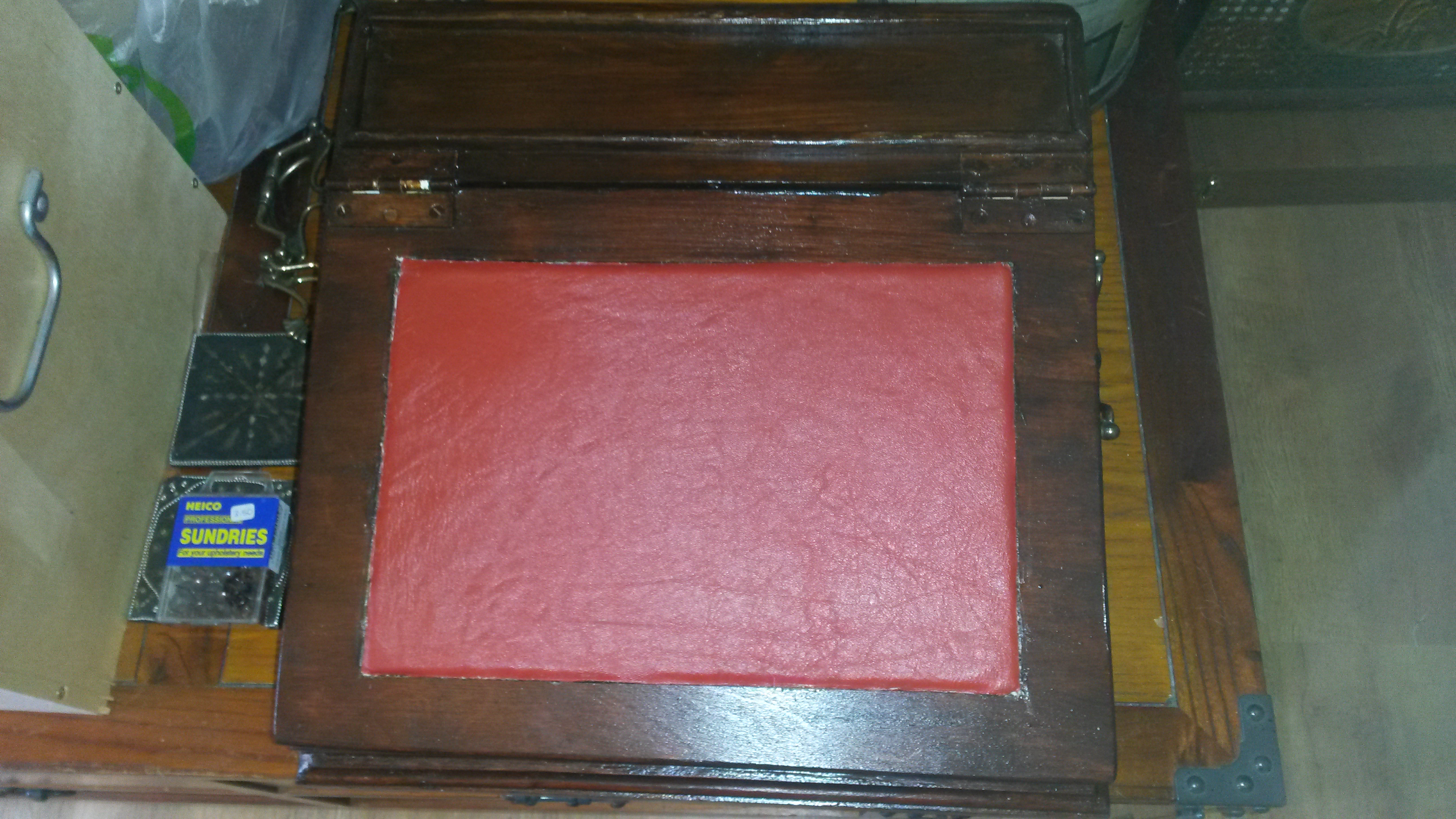 Vintage Writing Slope Homemade in the 1940s/50s From Rough Timber Sympathetically Renovated, new leather insert on slope, new red felt lining, replacement vintage brass handle to each side. £25.00 collection only from Sheffield as very bulky and heavy |