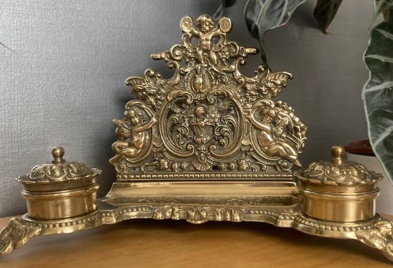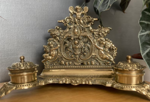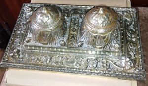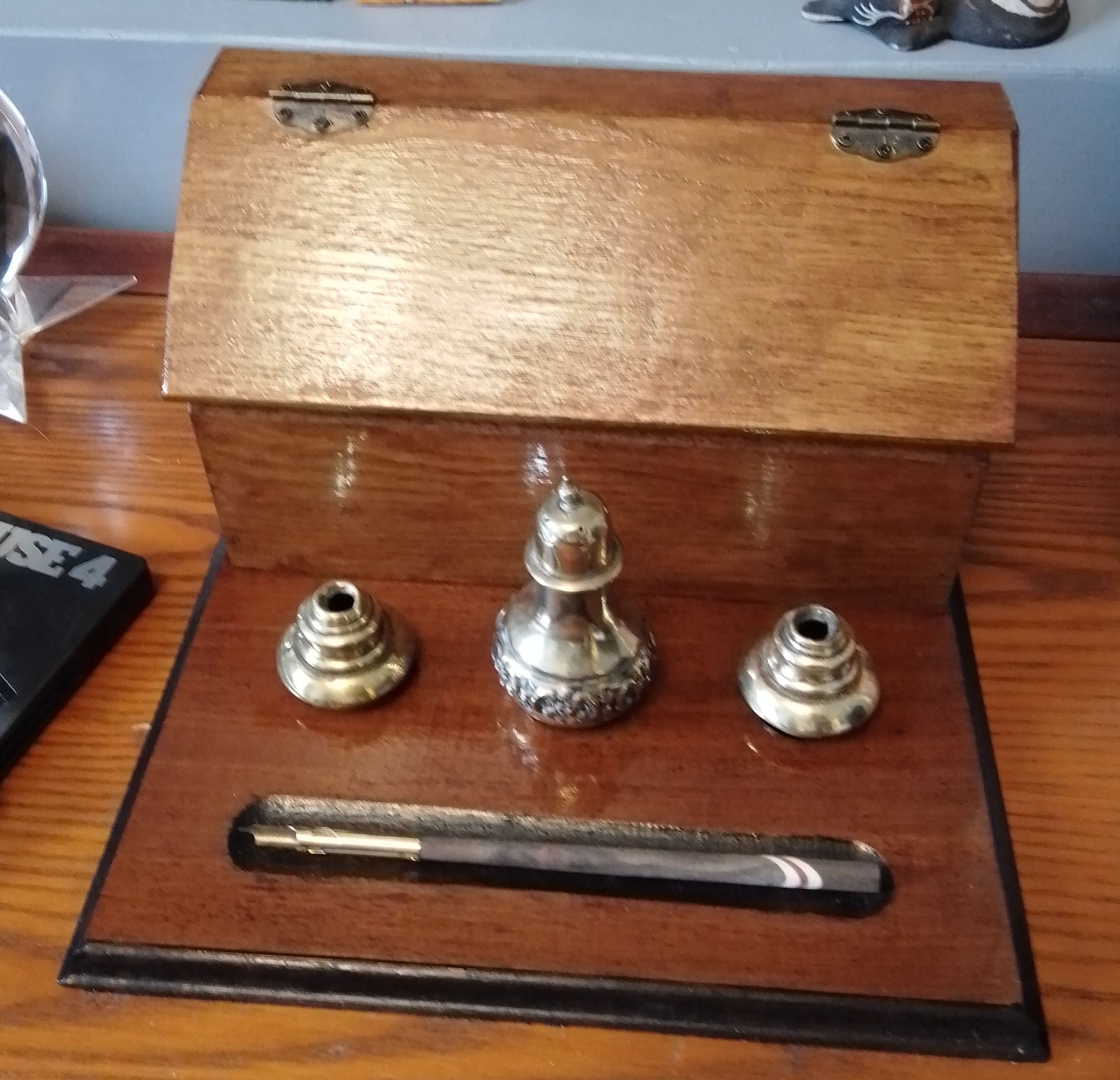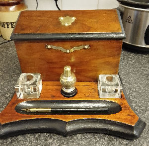 Antique Sympathetically Renovated Inkstand/Stationary Box with Dip Pen (AB) original brass decorations, original inwells(no lids) antique brass ponce pot(not original) Beautiful piece £70.00 plus p&p |