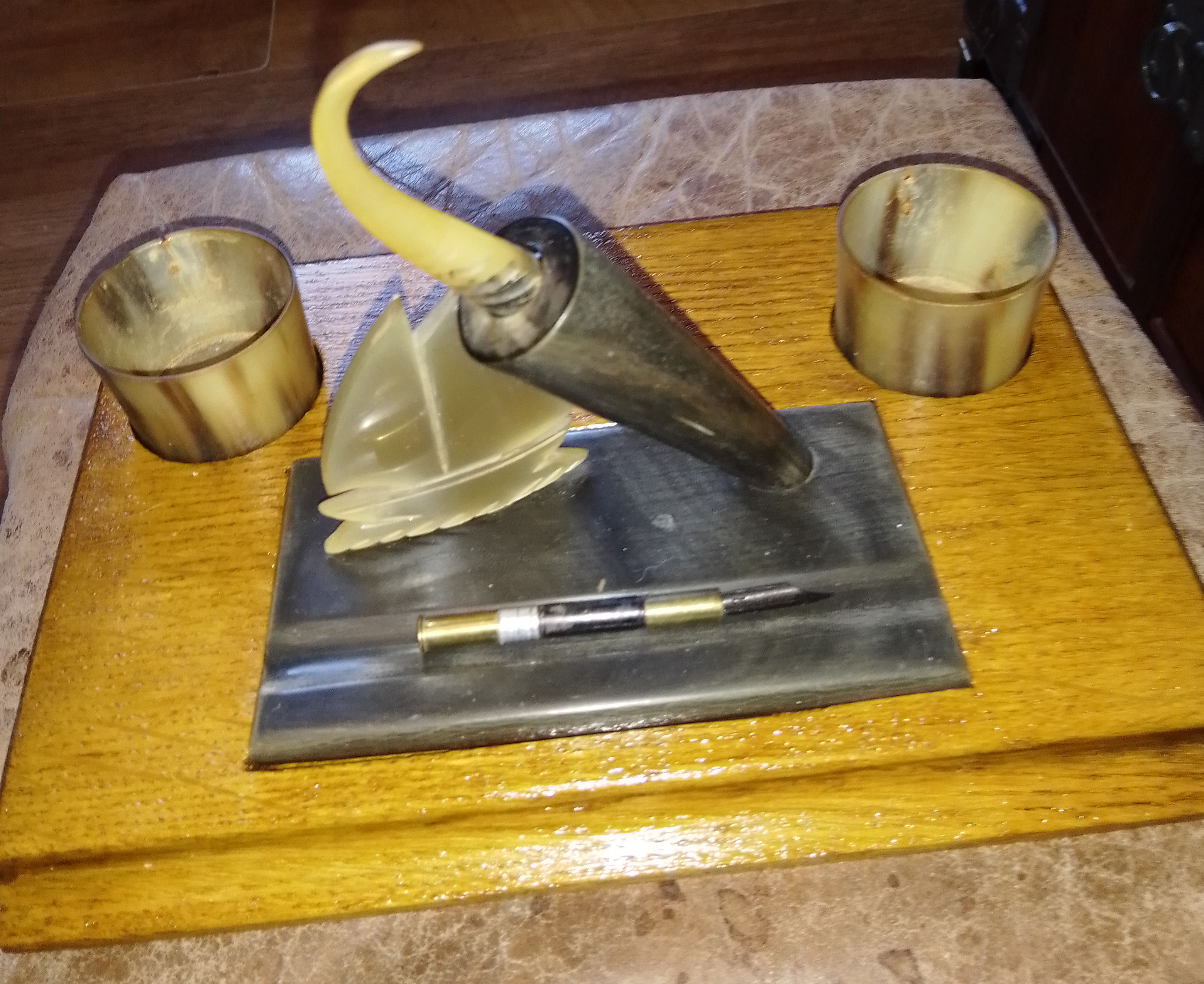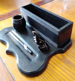 Ebonised Elephant Inkstand/Letter Rack with Dip Pen made from recycled oak, antique/vintage real ebony wood ink pot with bakelite liner, bovine carved elephant. £40.00 plus p&p