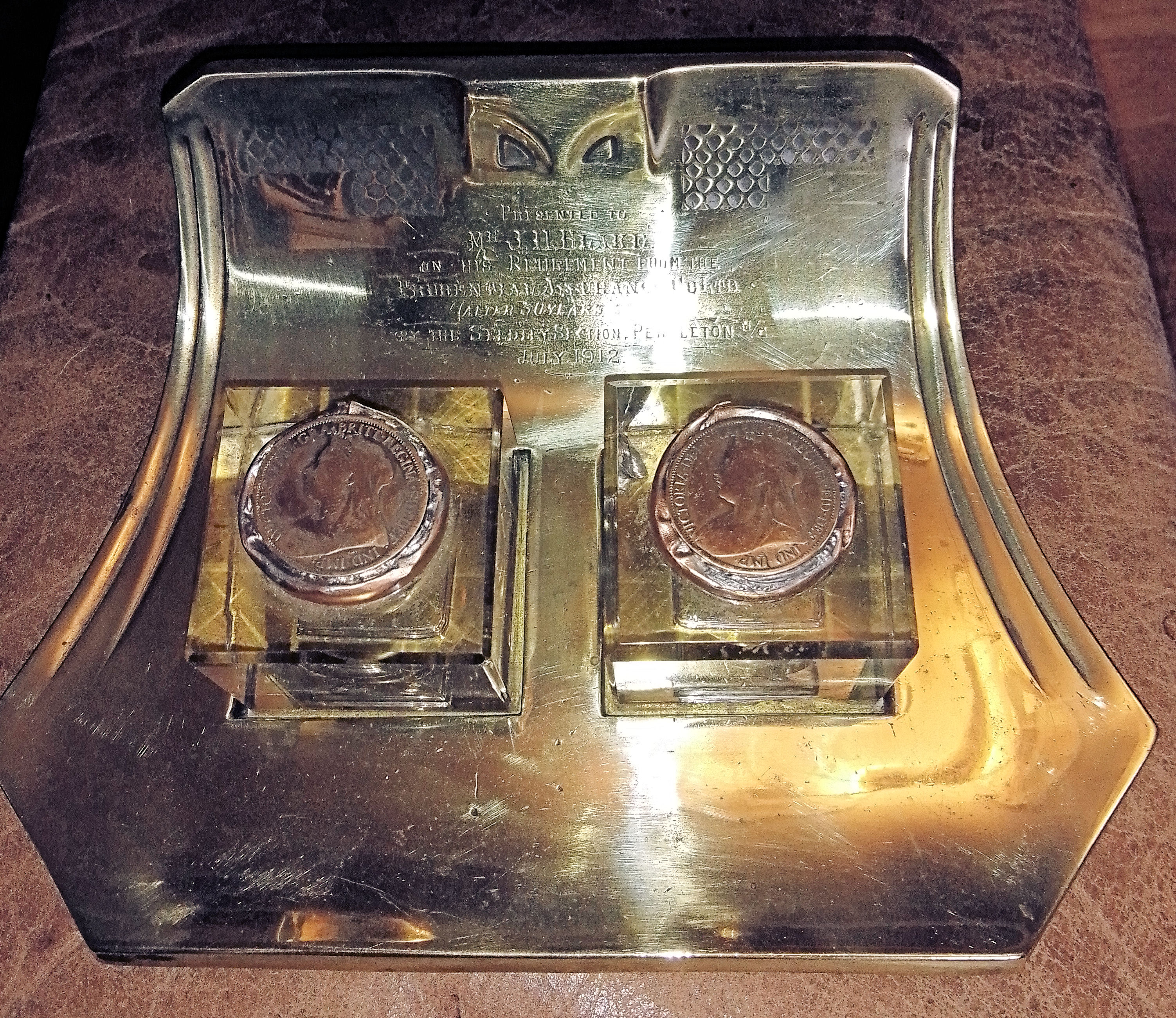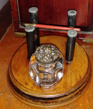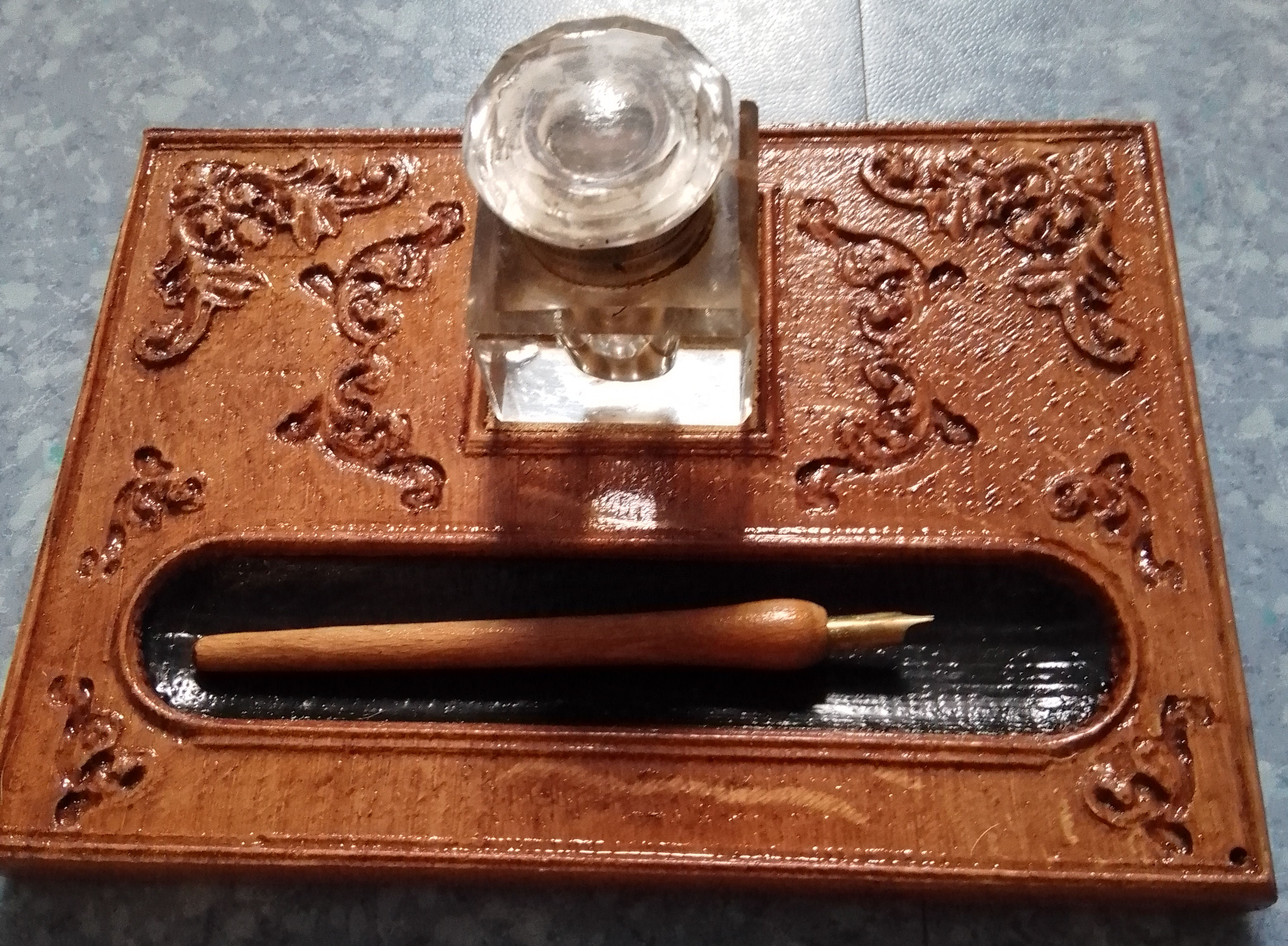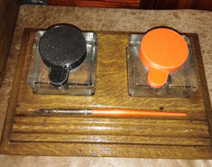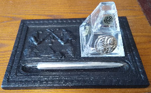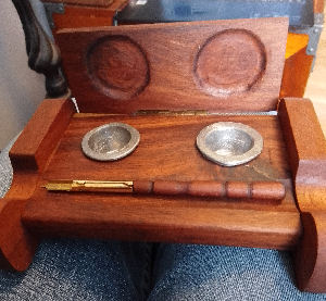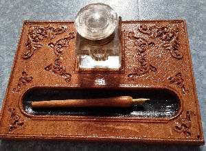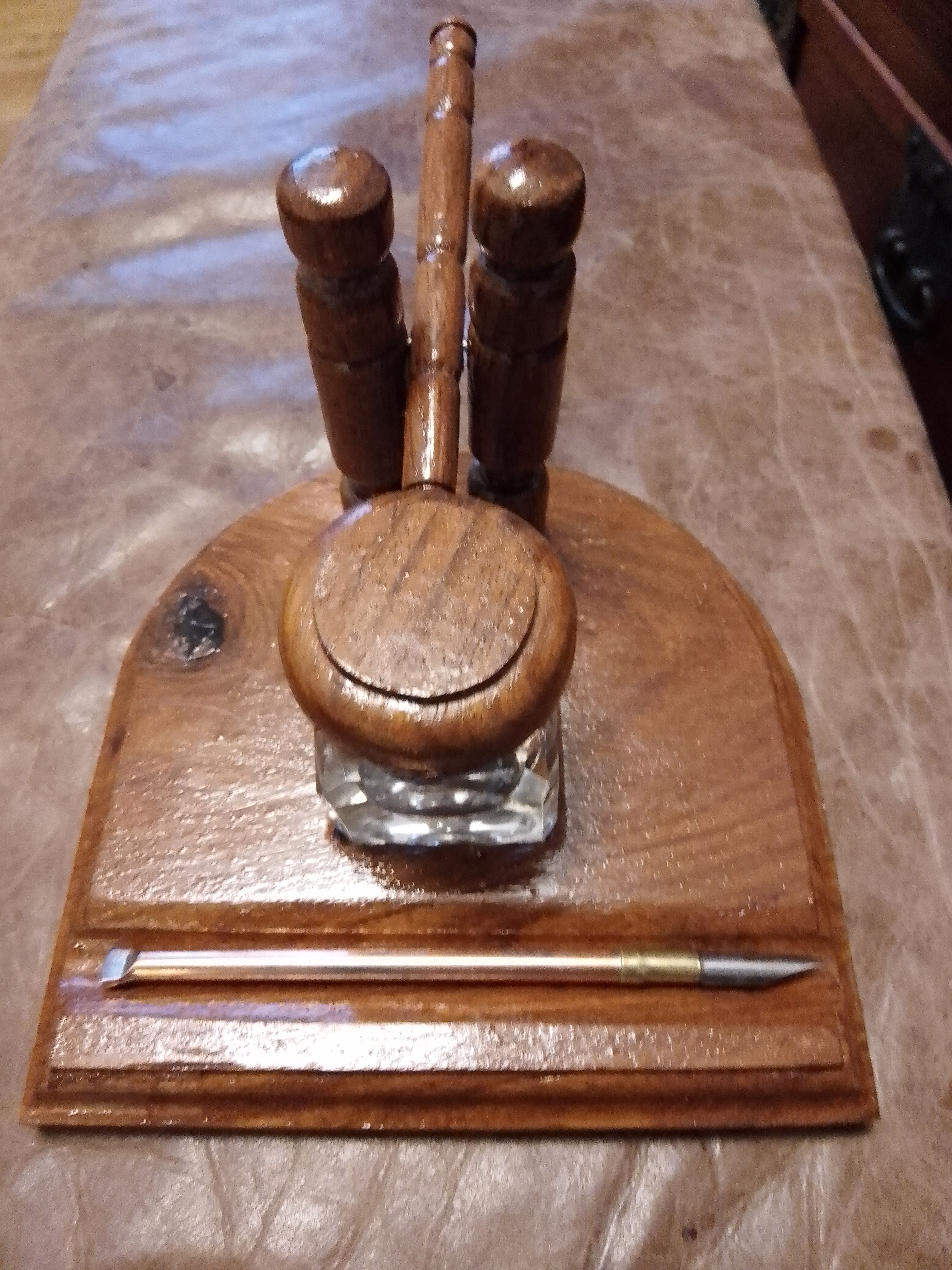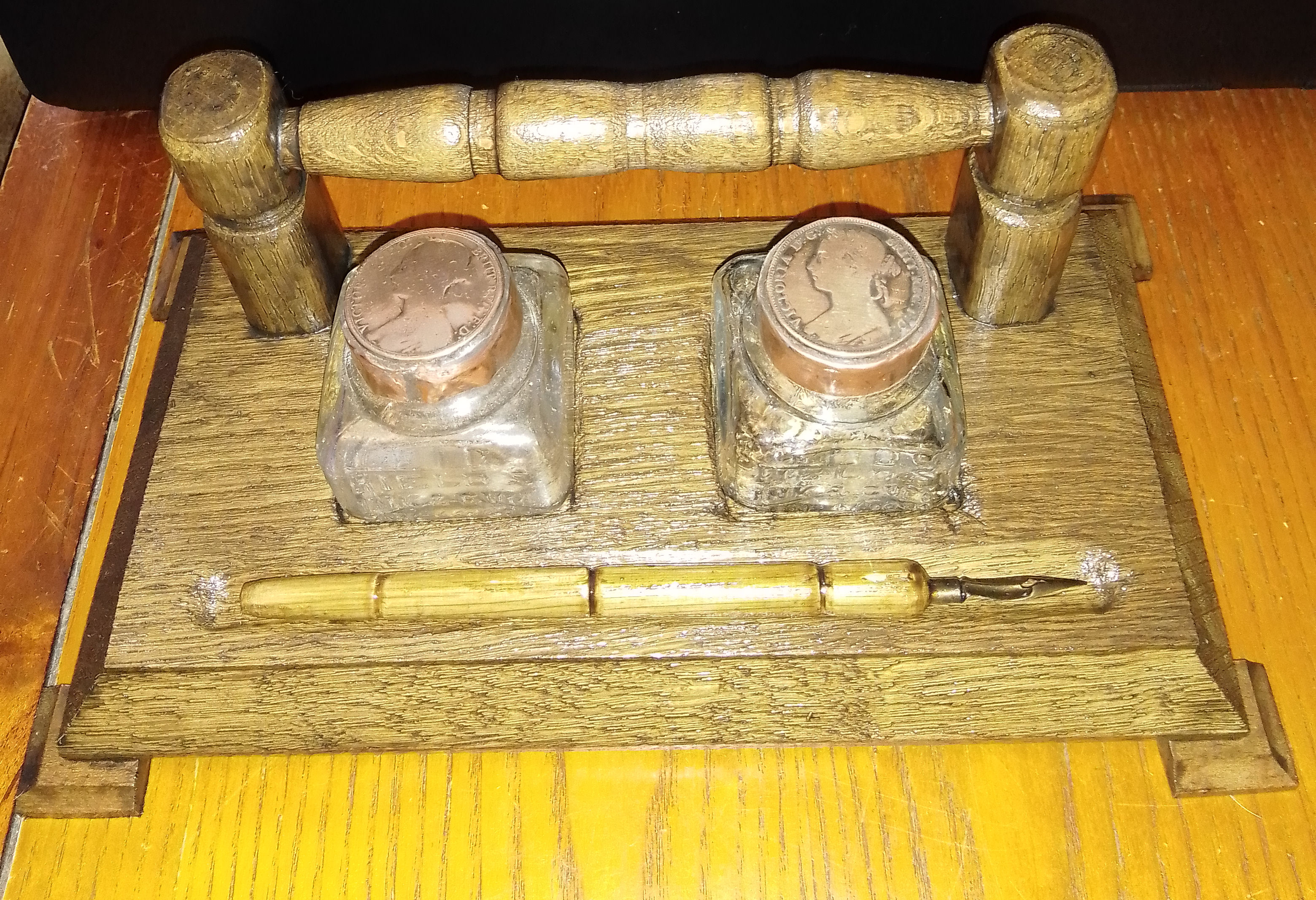 Penny Topped Inkstand. Handcrafted oak base with two antique/vintage glass ink bottles with manufacturers details. Slight crack in one bottle but no leaks, Handmade copper lids with inset Victorian pennies. Handmade wooden shaft dip pen. One of a kind. £28.00 plus p&p. |