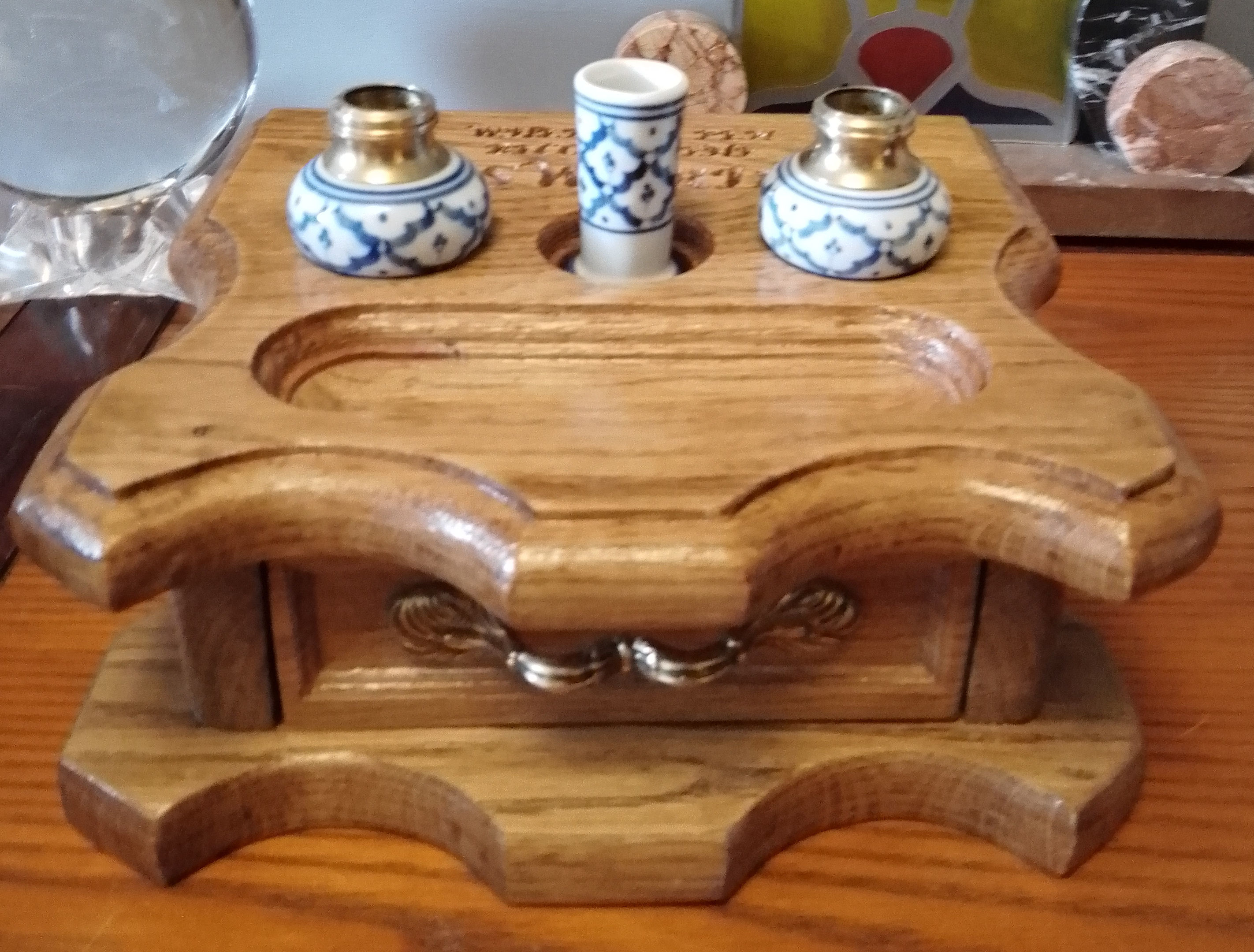 "When the Pen Becomes the Sword" Oak Inkstand with Drawer made from recycled oak, vintage brass handle to drawer, repurposed oriental ceramic and brass condiment pot inkwells. £85.00 plus p&p