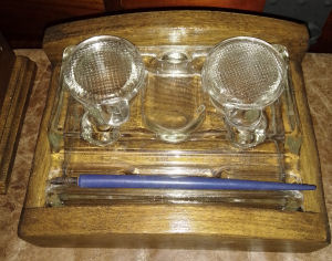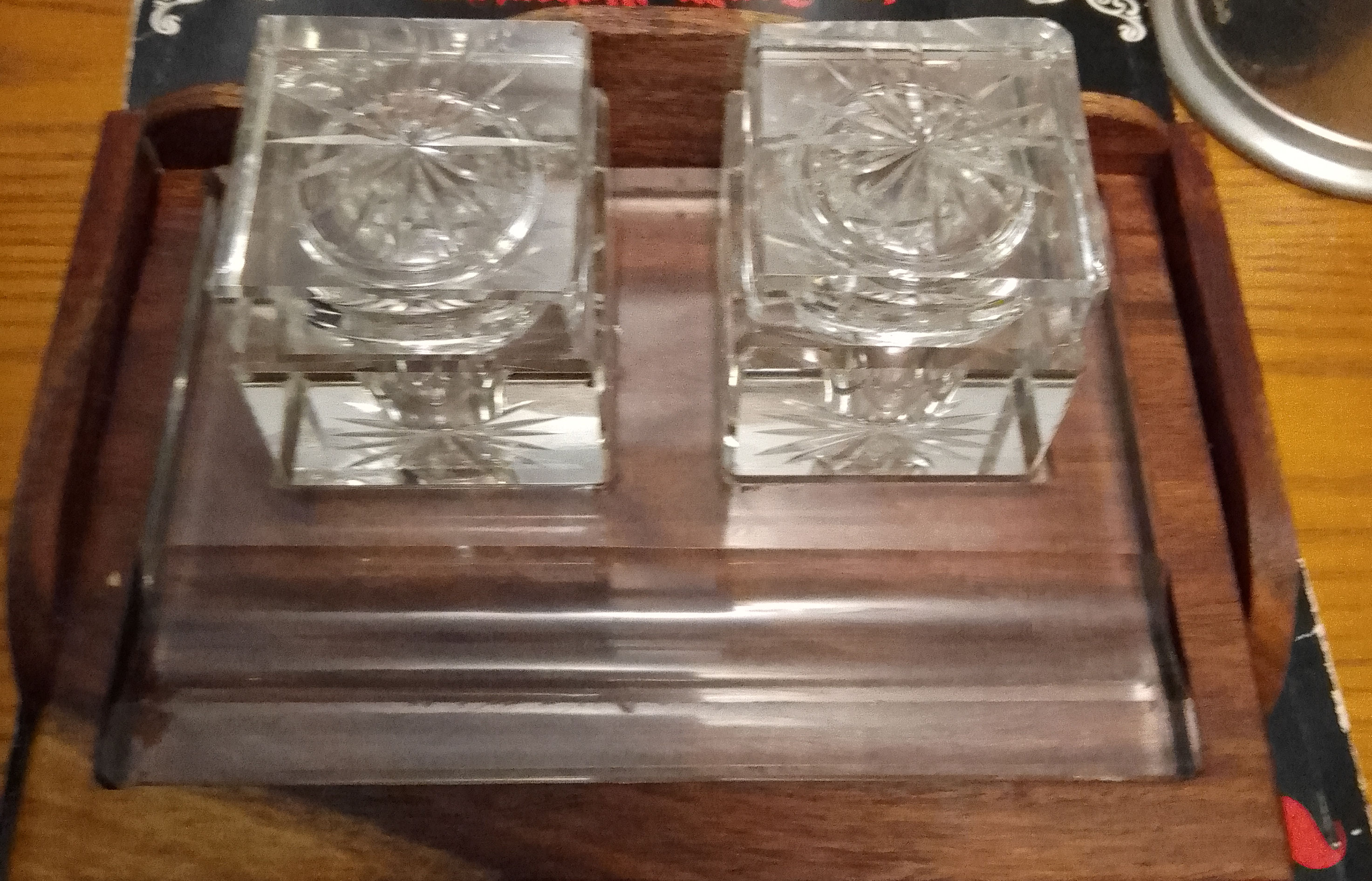 Crystal Glass Double Inkstand Set in Oak Base made from recycled wood, vintage crystal glass inkwells have some large chips commensurate with use and age but is still a beautiful usable piece. Condition refelected in price £30.00 plus p&p