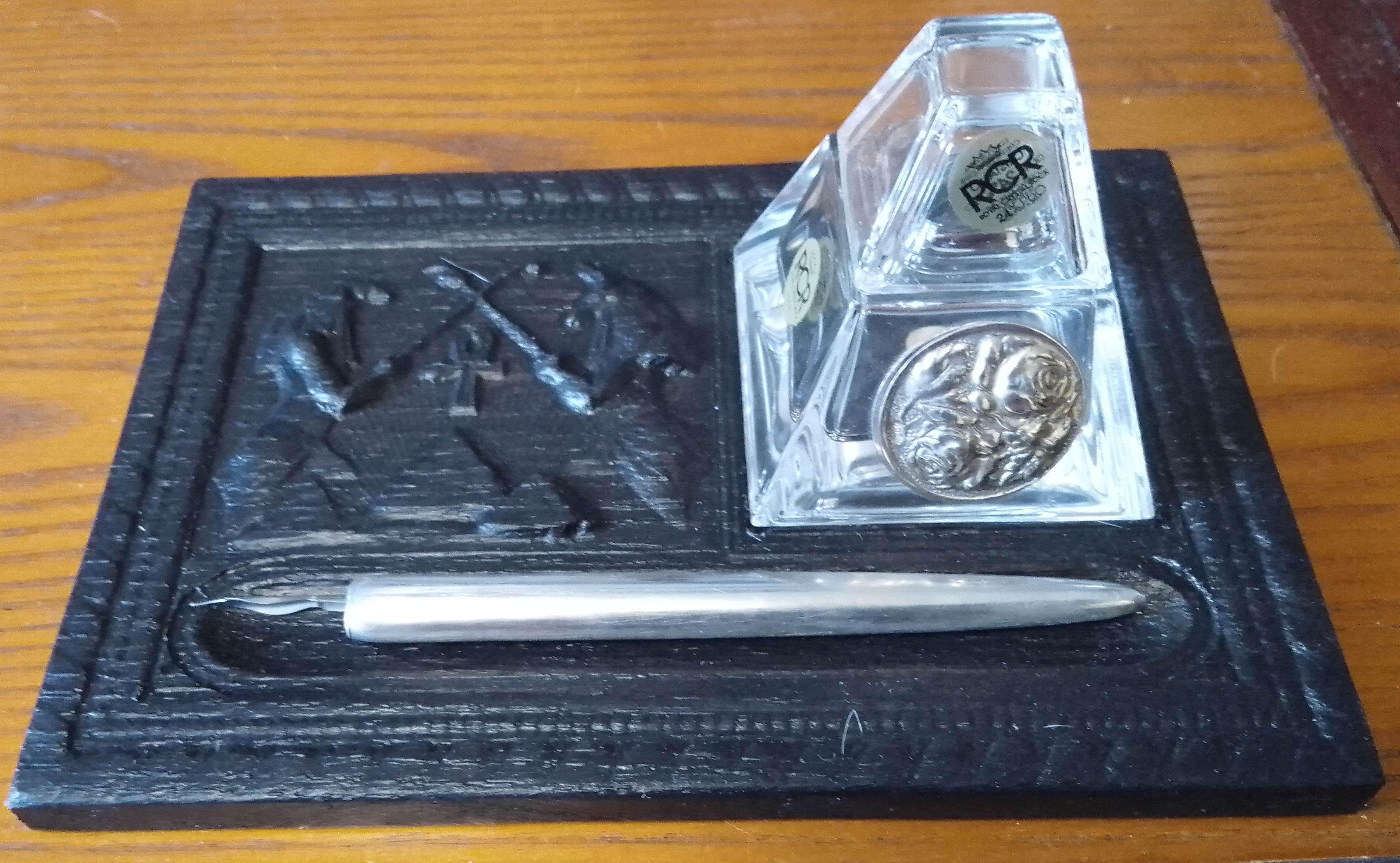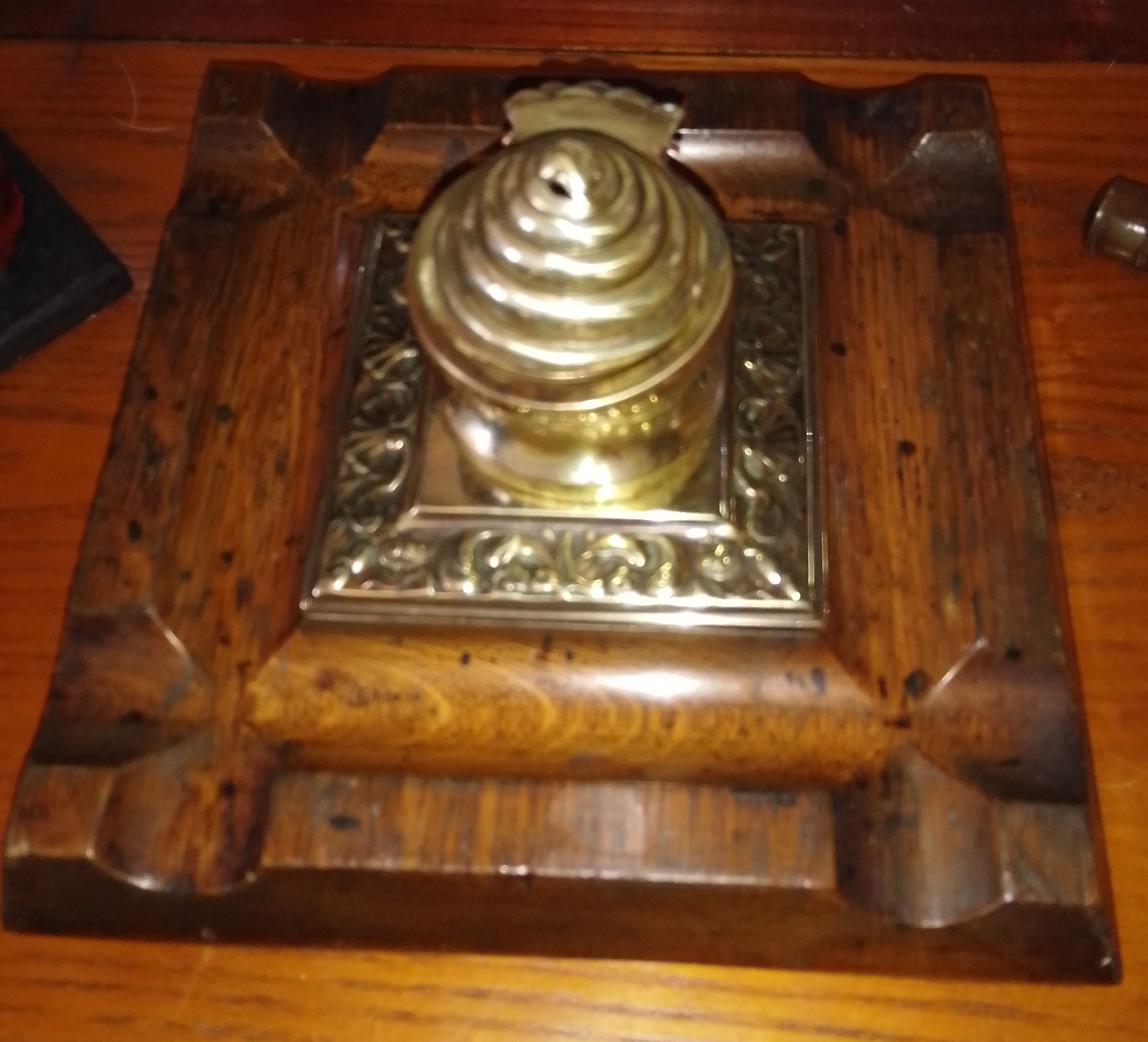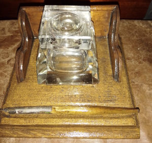 2 Scroll Oak Inkstand with Dip Pen made from recycled wood, antique glass inkwell with some chips commensurate with age and use. £28.00 plus p&p