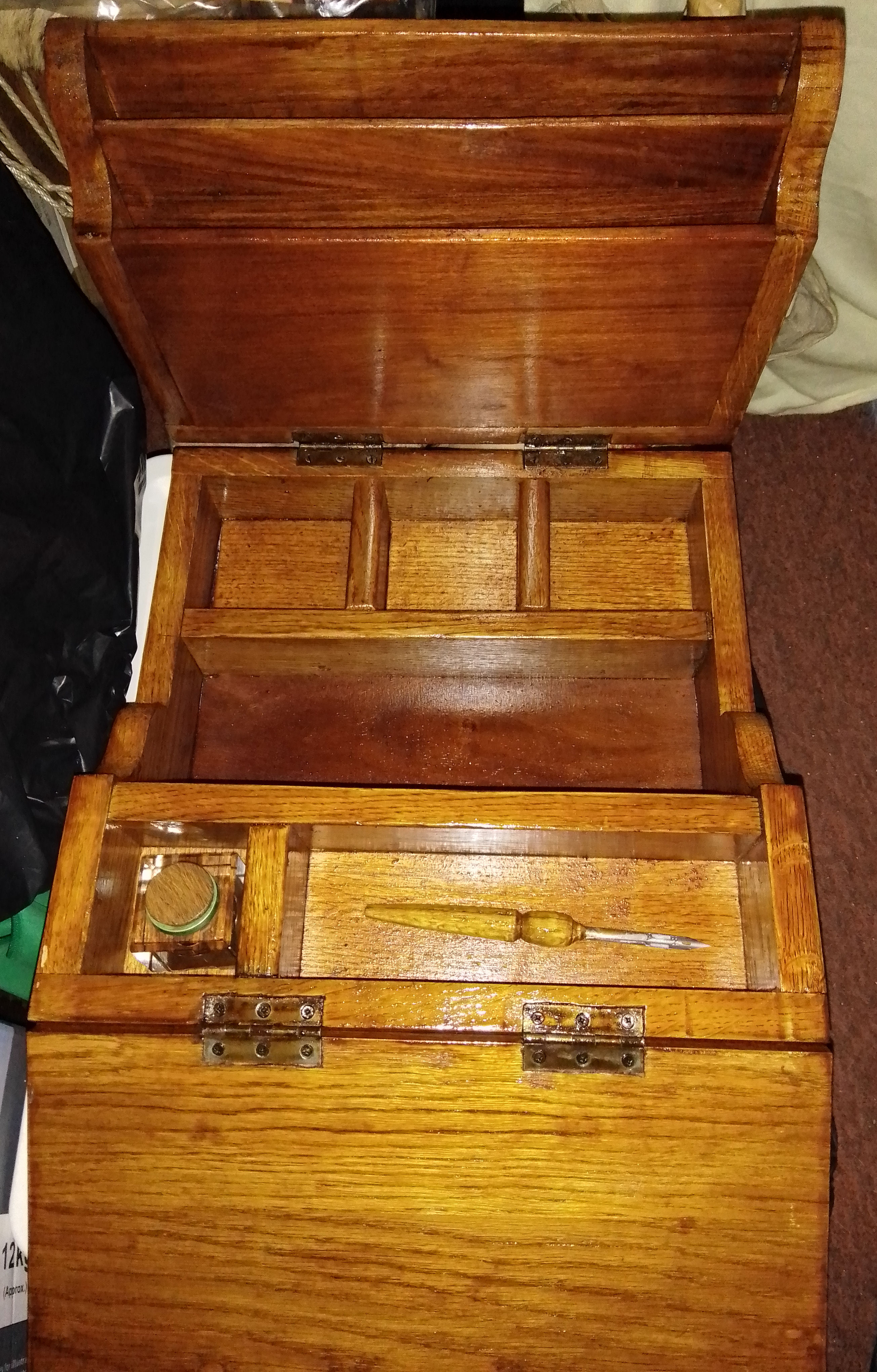 Oak 'Desk in a box' Writing Slope and Stationary Storage combined all folds down into a large box. Made from recycled wood, antique/vintage glass inkwell with new wooden top, dip pen, two small drawers with vintge brass handles, storage section for paper or documents, compartments for small stationary items. Lid of box folds forward to form a writing slope (pic 1). Amazing item for the avid writer. £175.00 collection only from Sheffield as very bulky and heavy. |