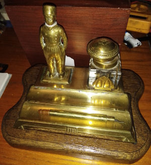Art deco brass inkwell with a standing Dutch boy figure and brass lidded glass ink bottle. Measures 3in x 8in. Set into a handmade shaped oak plinth made from recycled wood teamed with a modern brass and wood dip pen. £45.00 plus p&p.