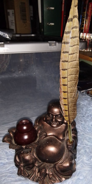 Revamped resin Buddha inkstand with pheasant quill pen. Rosewood inkwell £15.00 plus p&p. |