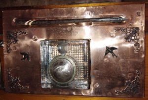 Handmade copper covered wooden inkstand with vintage glass inkwell set into a copper surround, topped with a George 5th penny lid. Decorated with embellishments and complete with handmade wooden dip pen. A truly unique piece by Mick @ Spooktacula Exclusive Designs. £80.00 plus p&p