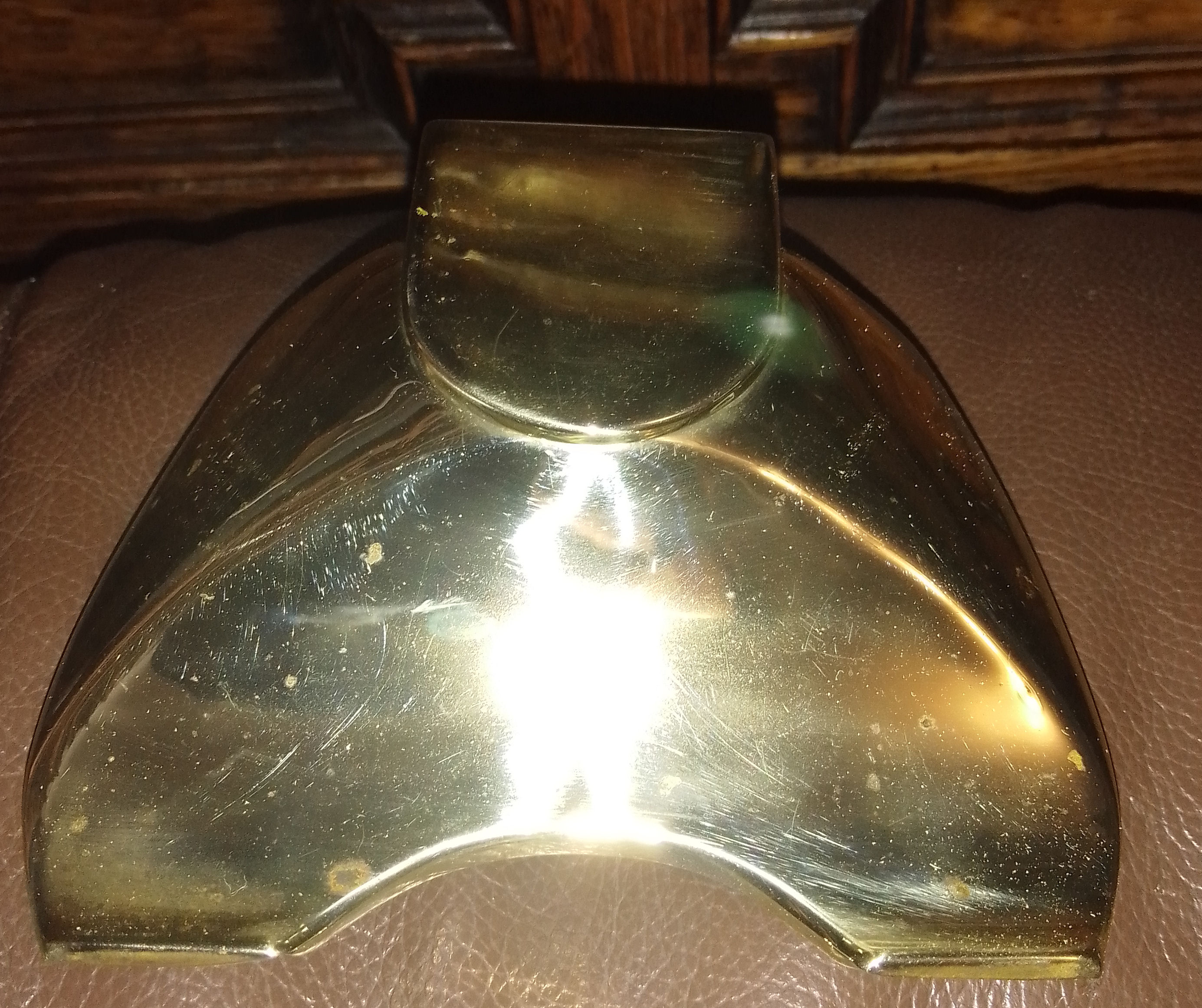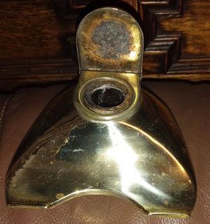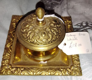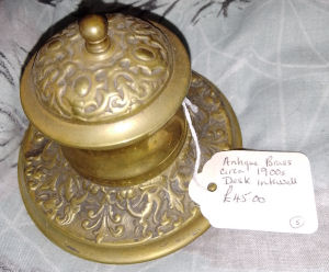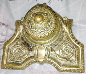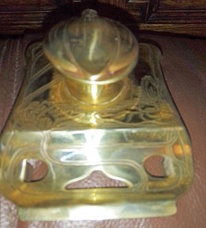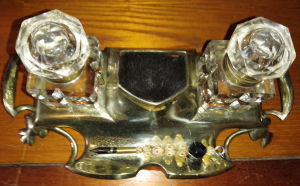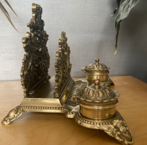 Antique brass inkstand with original glass lidded inkwells and brush nib wipe. The bristles are worn down on the nip wipe but the stand is in very good used condition. Comes with hand made dip pen. Polished to a deep shine. Very rare and unusual item £120.00 plus p&p