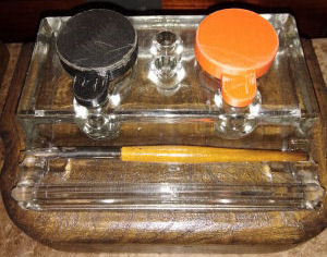 Art Deco Sympathetically Renovated Glass Inkstand with Roll Top Inkwells and Dip Pen. Black glass base, inkwells with liners, bovine/wood/metal pen. £130.00 plus p&p and insurance but collection from Sheffield preferred