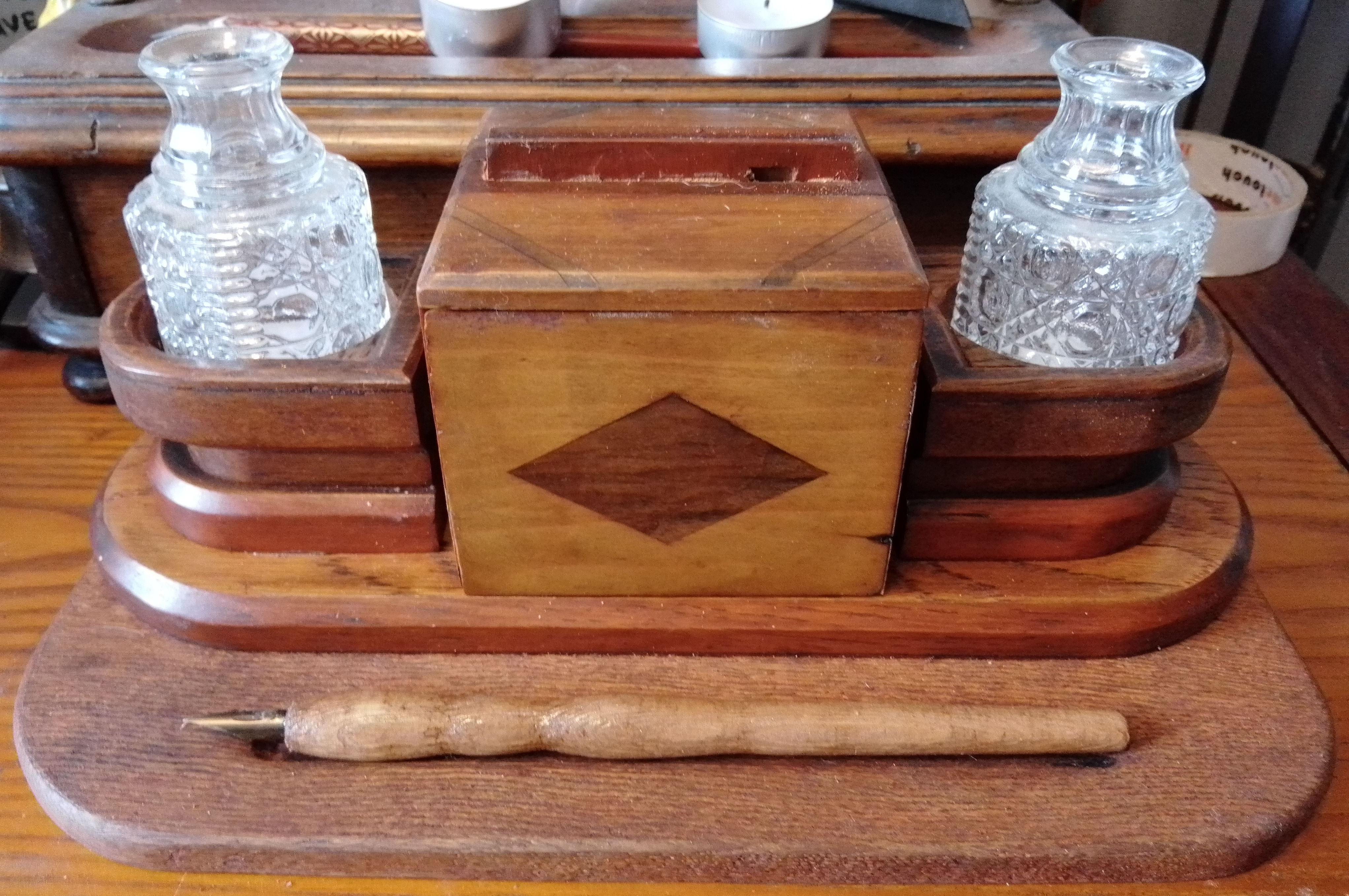 Victorian Style Inkstand/Stationary Box with Dip Pen made from recycled oak and mahogany with repurposed condiment pot inkwells and ponce pot. £50.00 plus p&p |