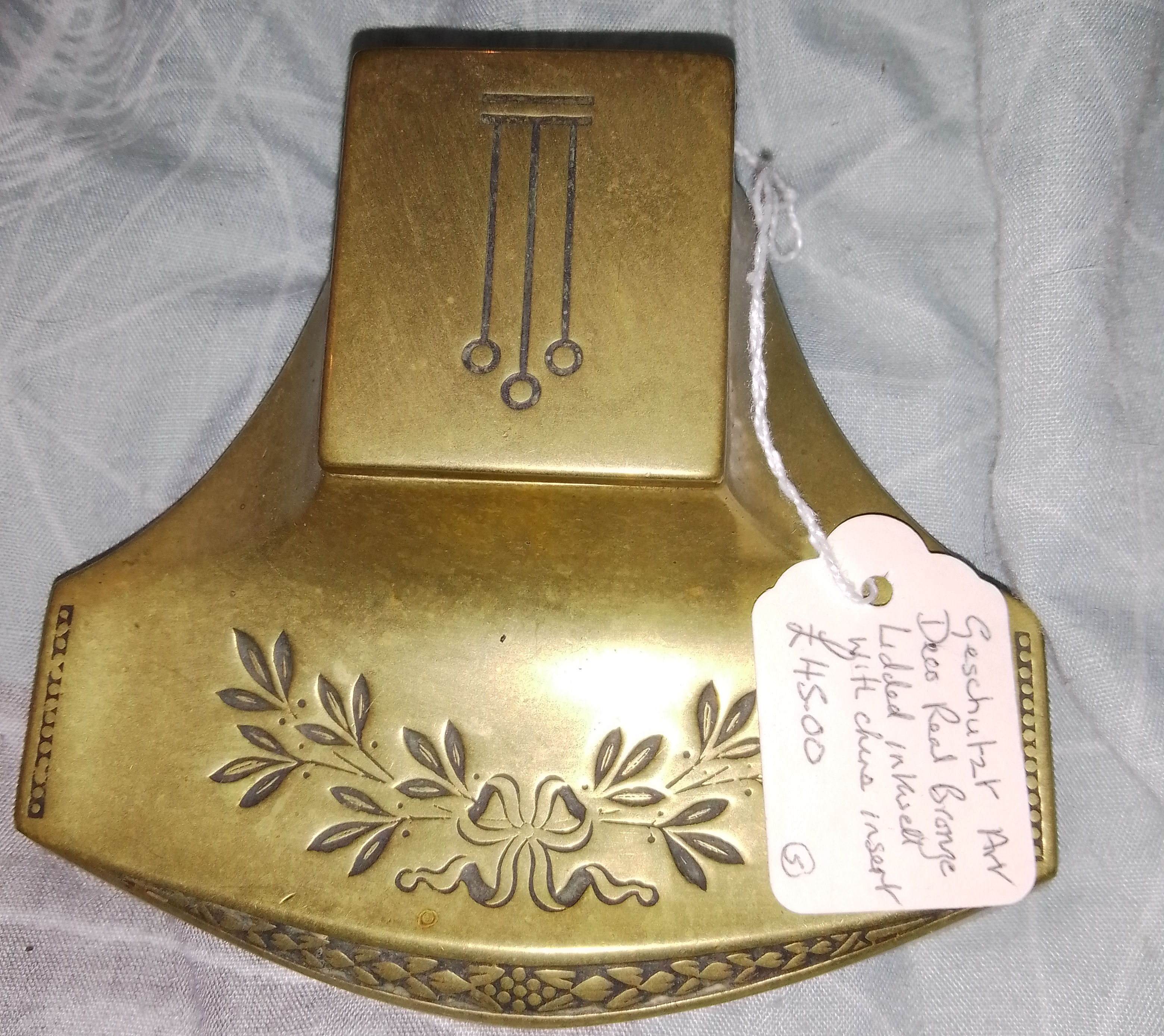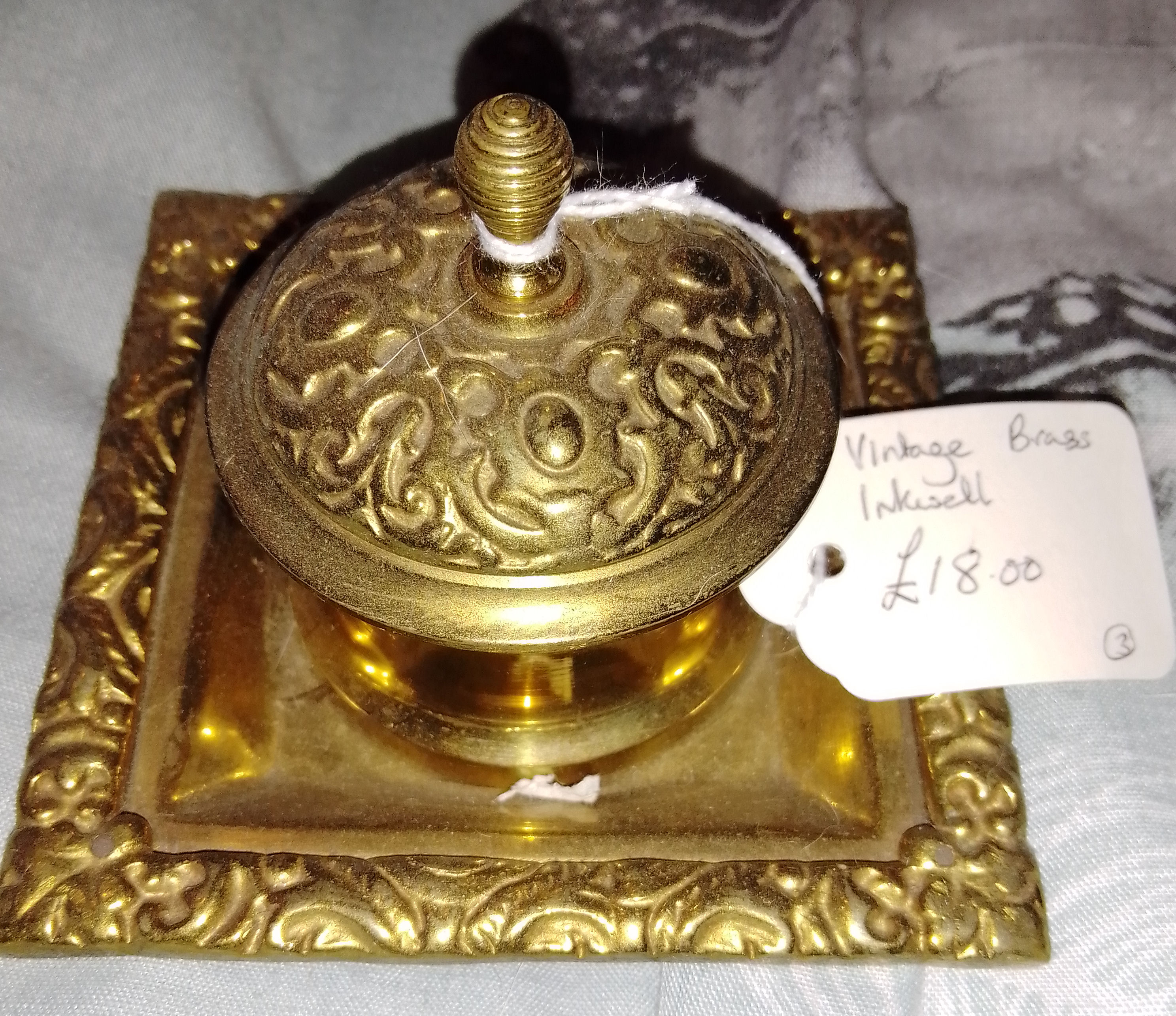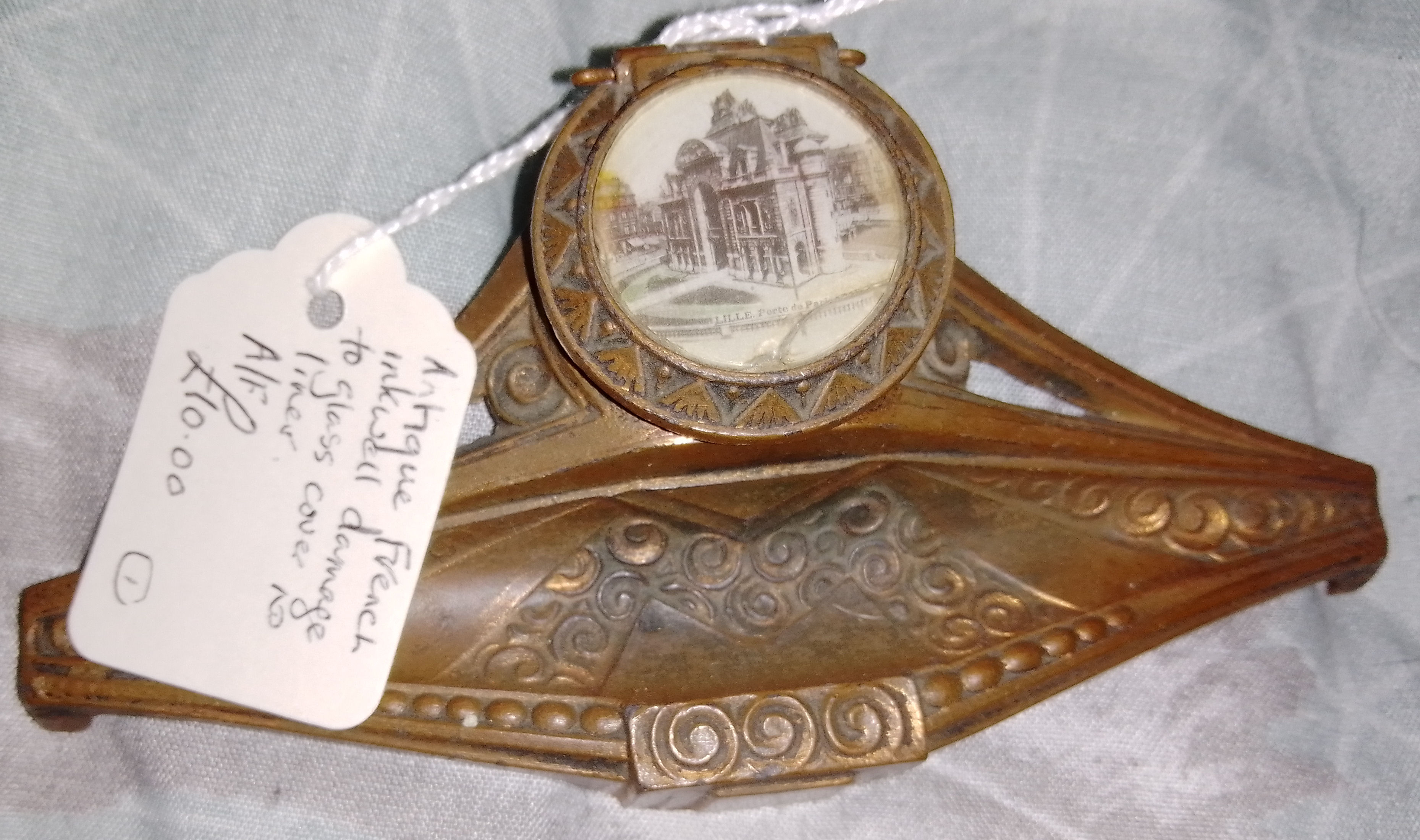Vintage/antique heavy brass inkstand. Lid on inkwell has had its hinge repaired. One of the ceranmic liners has a crack. Brass has been polished. Lovely item £45.00 plus p&p but would prefer collection in person due to weight.