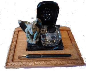 Garoyle and Gravestone Inkwell. Handcrafted Oak base, wooden gravestone painted black with inscription "The written word is not dead", resin gargoyle and black resin base, vintage glass inkwell with modern black wooden stopper, black wooden dip pen. One of a kind. £35.00 plus p&p.