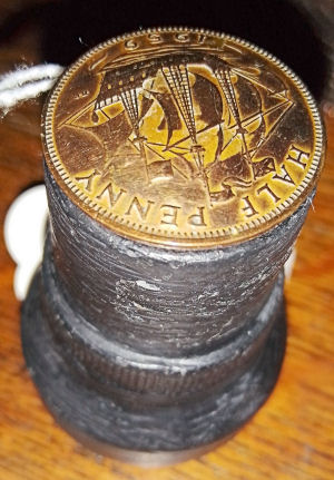 Ebonised wood miniature inkwell with 1959 half penny lid. Unique item £6.50 plus p&p |