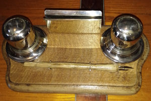 Antique Sympathetically Renovated Patent Pending Inkstand with Dip Pen (BB) Very Unusual Design. Original metal handle and drawer pull, original inkwells and inkwell holders, new wooden lids. Lovely item £125.00 plus p&p