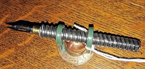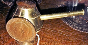 Brass and copper miniature dip pen holder topped with a vintage half penny coin, adorned with a George V penny and standing on another half penny. Comes with brass dip pen. A unique handmade piece £15.00 plus p&p